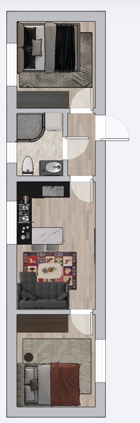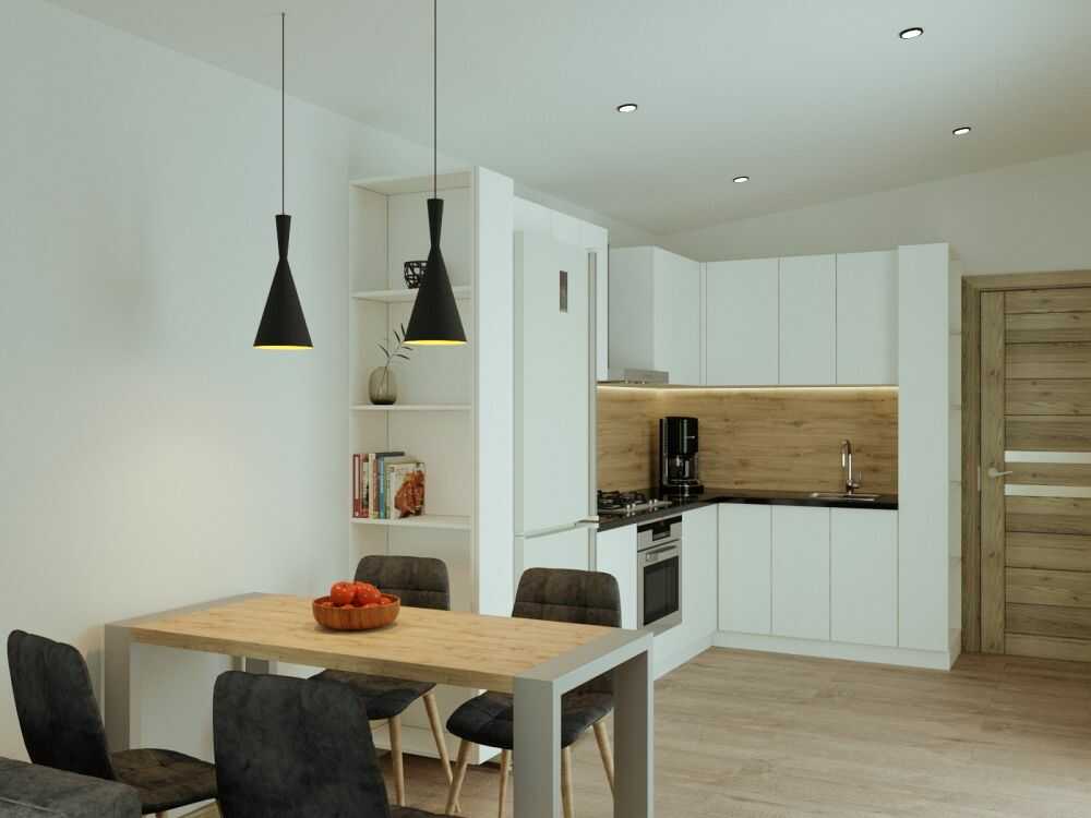 - Kitchen: worktop with HPL panel, cabinets made of furniture panels,