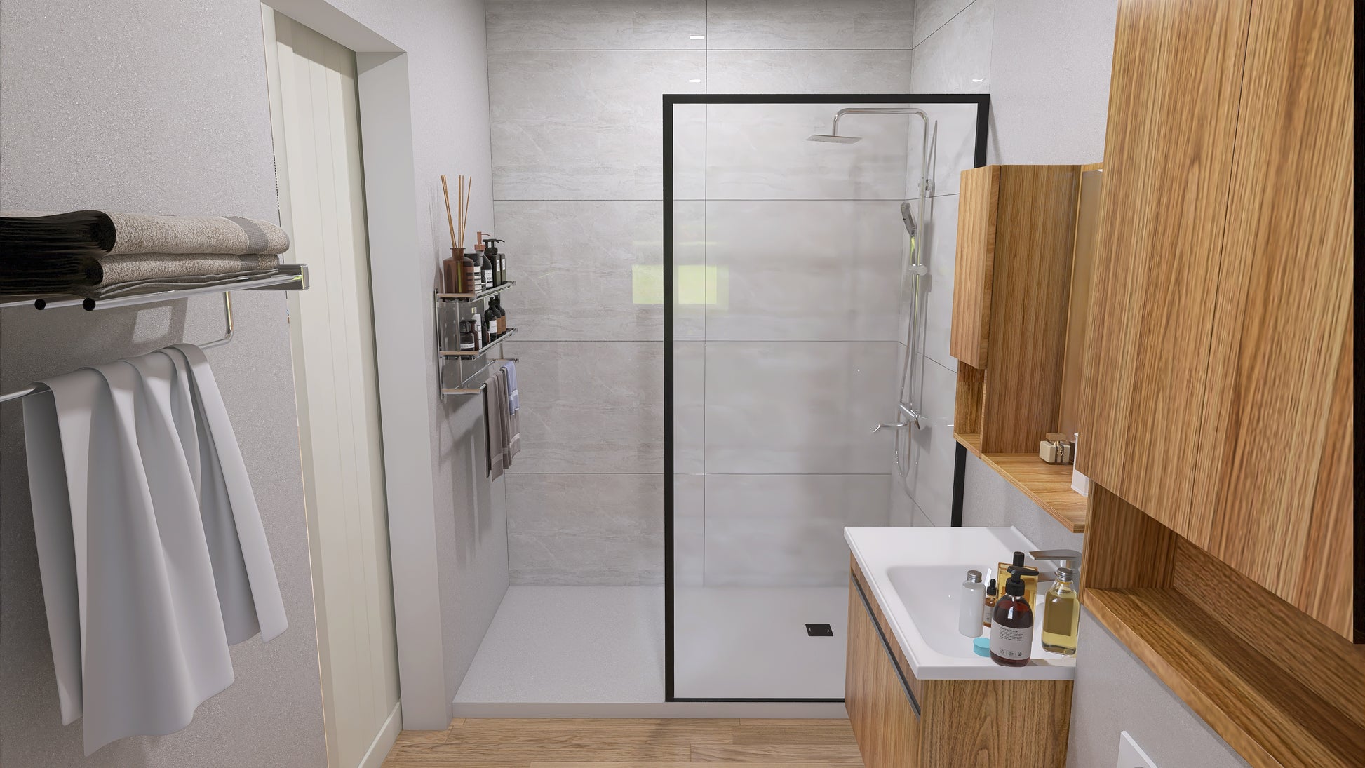 - Fully finished facade (combination of thermally modified wood and standing seam metal panels), roof covering , windows and doors