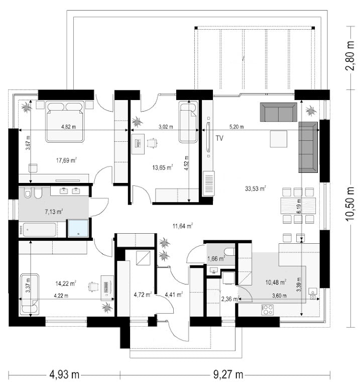 House dimensions: 14.2 m x 10.5 m