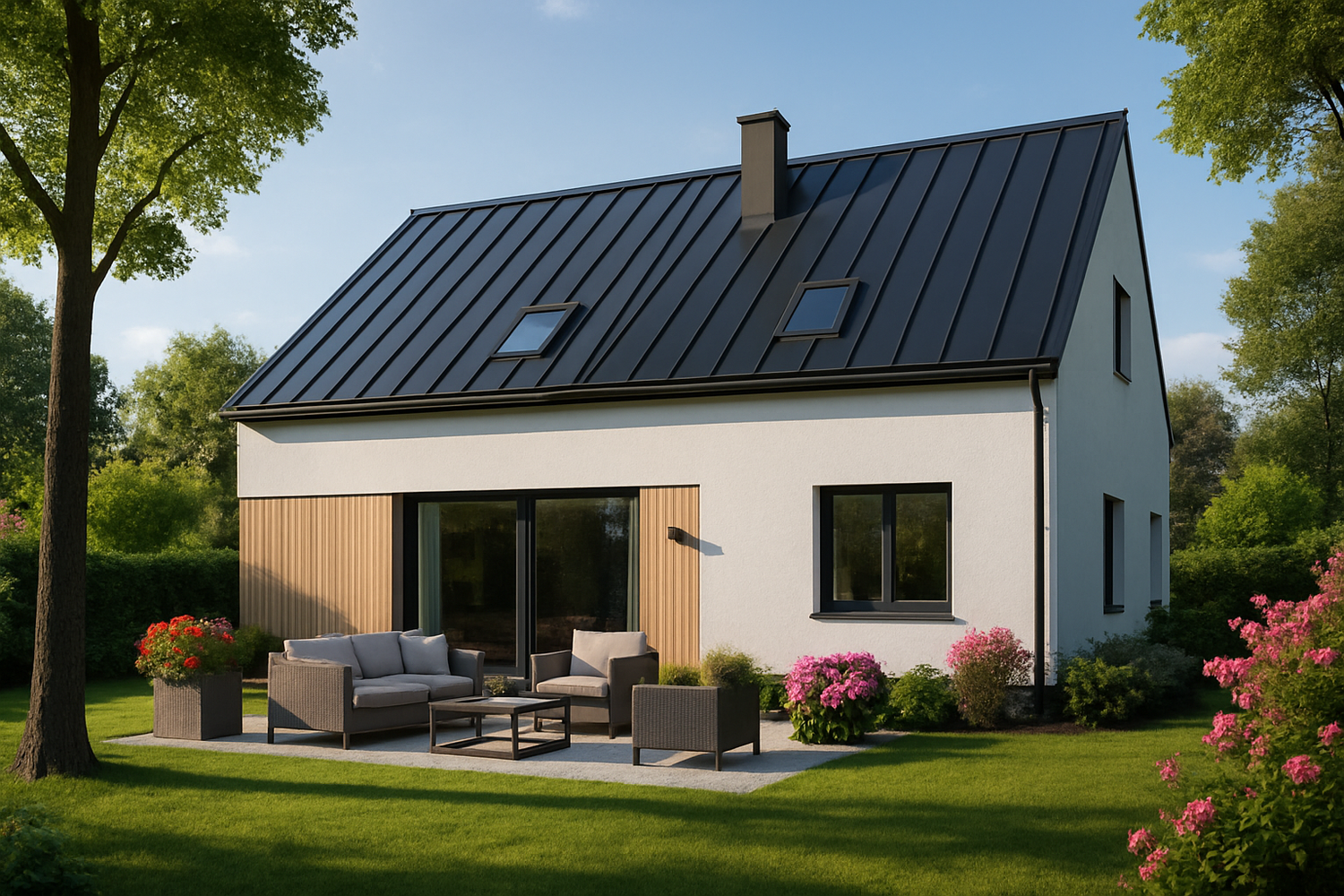 - Dach: gotowe pokrycie dachowe oraz system rynnowy