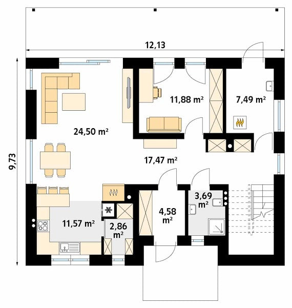 - Podłoga parteru: ocieplona wylewka oraz wodne ogrzewanie