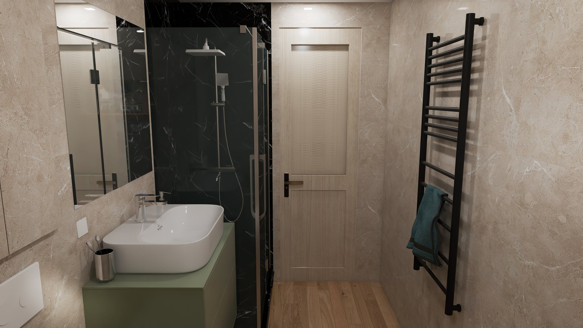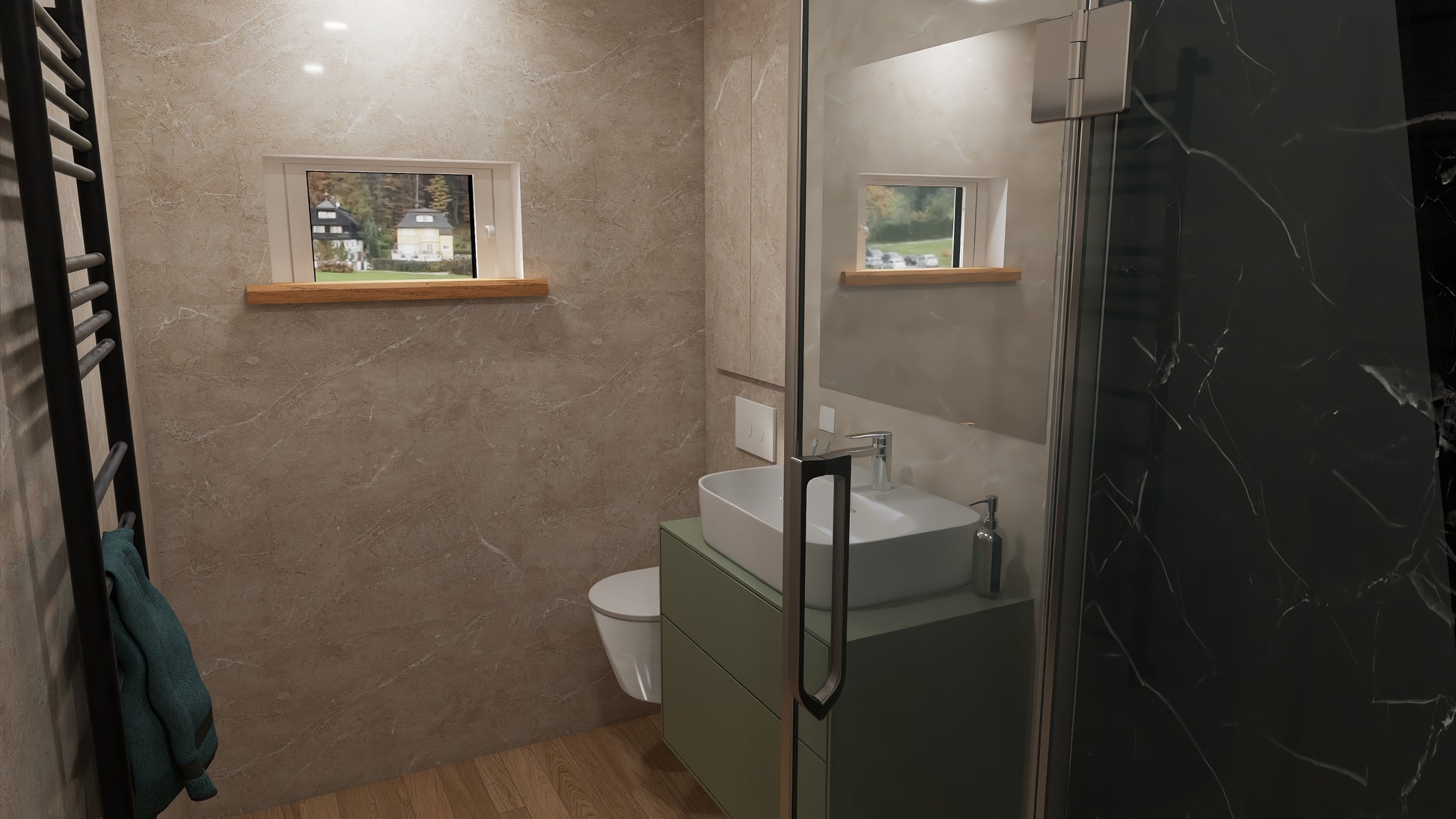 - Łazienka: płytki ceramiczne na podłodze i ścianach, kompletne wyposażenie sanitarne