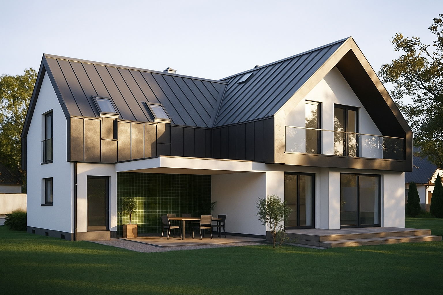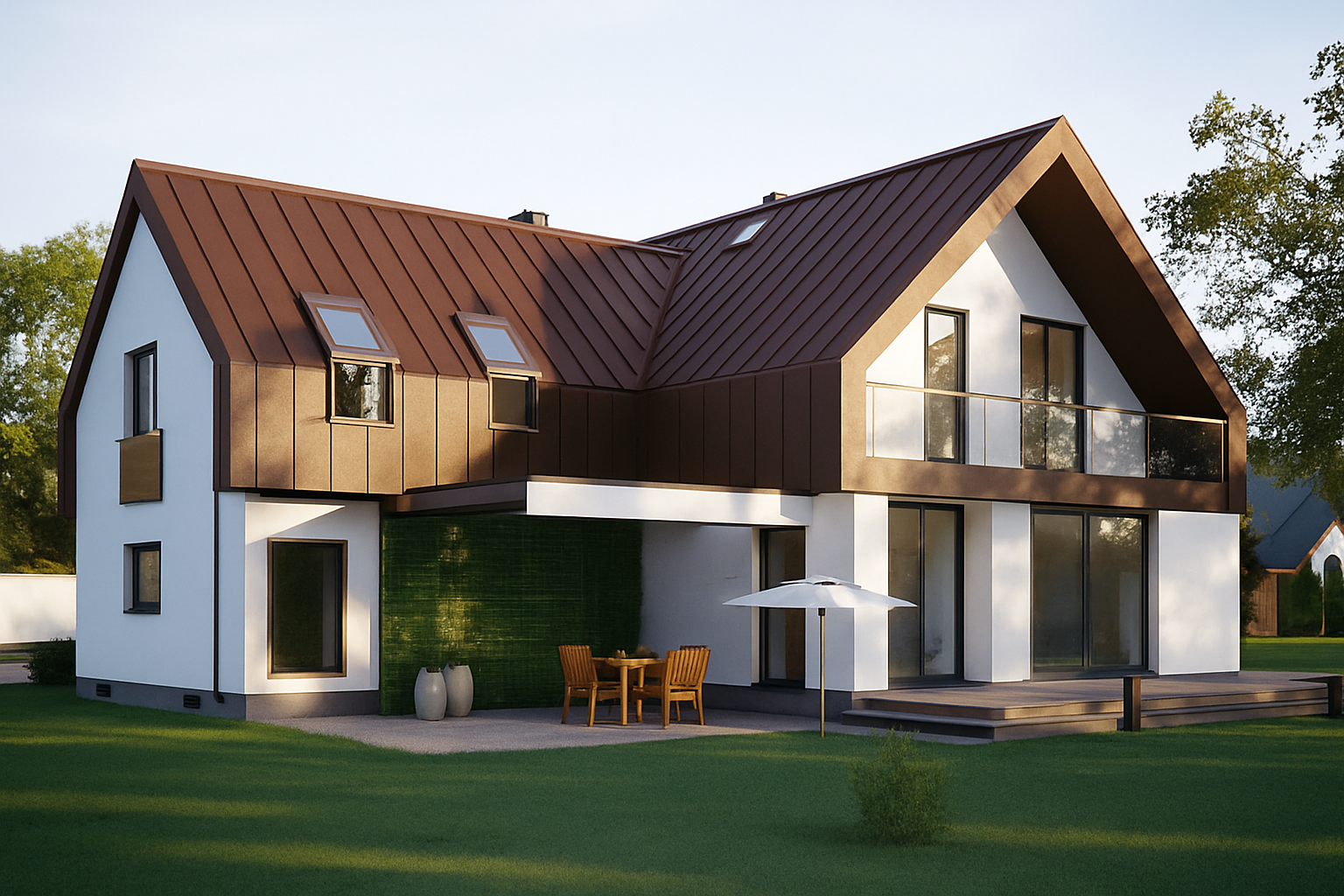 - Dach: gotowe pokrycie dachowe oraz system rynnowy